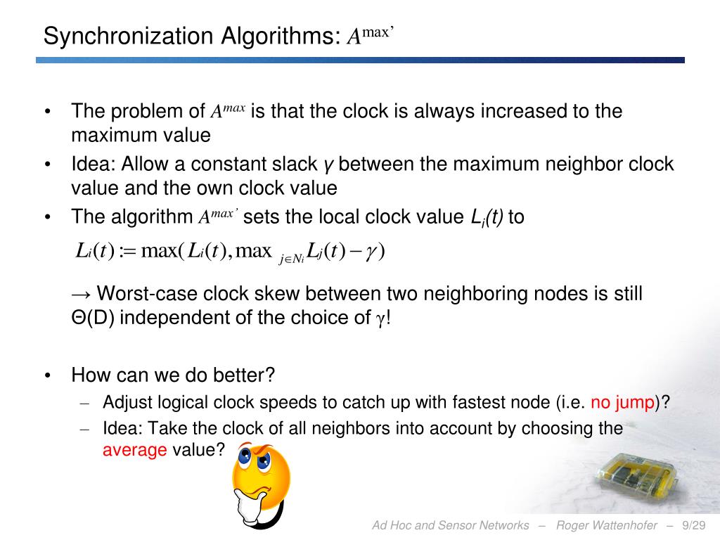 Synchronization Algorithms: Amax’ • The problem of Amax is that the clock is always increased to the maximum value • Idea: Allow a constant slack γ between the maximum neighbor clock value and the own clock value • The algorithm Amax’ sets the local clock value Li(t) to → Worst-case clock skew between two neighboring nodes is still Θ(D) independent of the choice of γ! • How can we do better? • Adjust logical clock speeds to catch up with fastest node (i.e. no jump)? • Idea: Take the clock of all neighbors into account by choosing the average value?