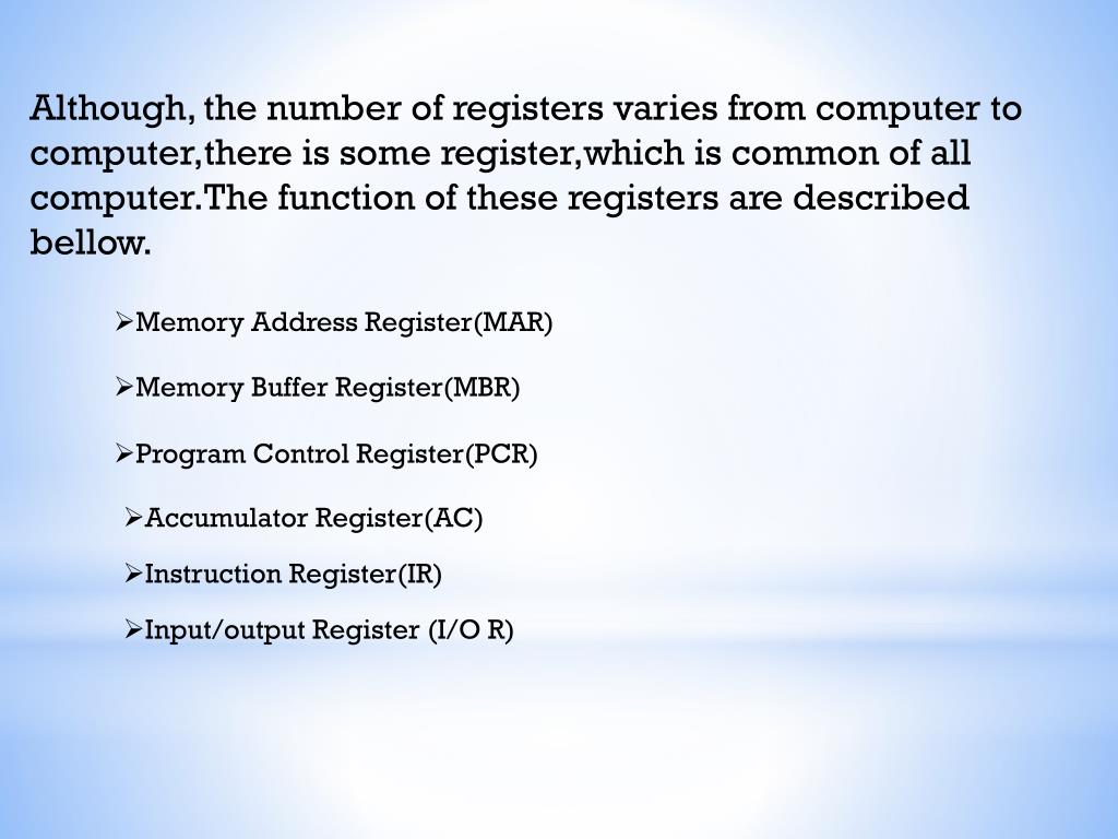 Although, the number of registers varies from computer to computer,there is some register,which is common of all computer.The function of these registers are described bellow. • Memory Address Register(MAR) • Memory Buffer Register(MBR) • Program Control Register(PCR) • Accumulator Register(AC) • Instruction Register(IR) • Input/output Register (I/O R)