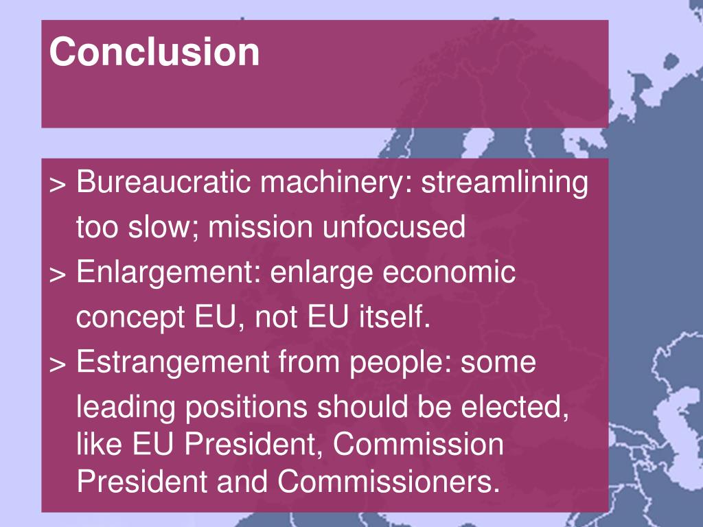 Conclusion > Bureaucratic machinery: streamlining too slow; mission unfocused > Enlargement: enlarge economic concept EU, not EU itself. > Estrangement from people: some leading positions should be elected, like EU President, Commission President and Commissioners.