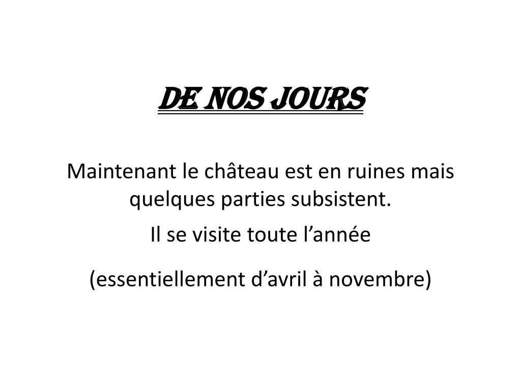 DE NOS JOURS Maintenant le château est en ruines mais quelques parties subsistent. Il se visite toute l’année (essentiellement d’avril à novembre)