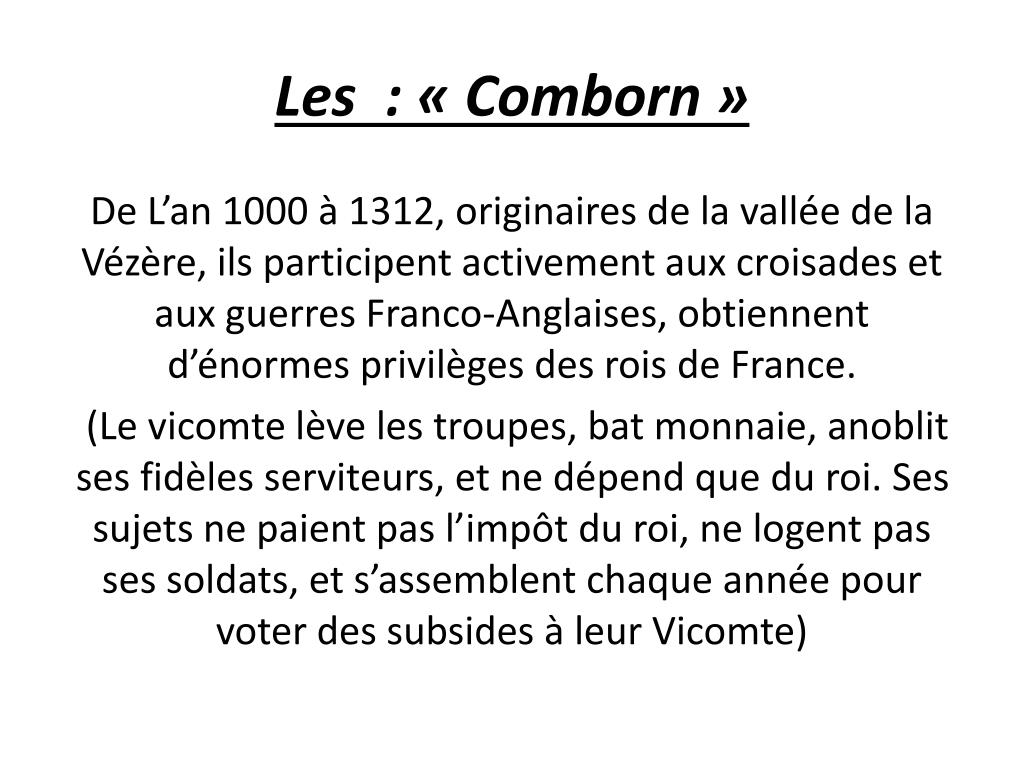 Les : « Comborn » De L’an 1000 à 1312, originaires de la vallée de la Vézère, ils participent activement aux croisades et aux guerres Franco-Anglaises, obtiennent d’énormes privilèges des rois de France. (Le vicomte lève les troupes, bat monnaie, anoblit ses fidèles serviteurs, et ne dépend que du roi. Ses sujets ne paient pas l’impôt du roi, ne logent pas ses soldats, et s’assemblent chaque année pour voter des subsides à leur Vicomte)