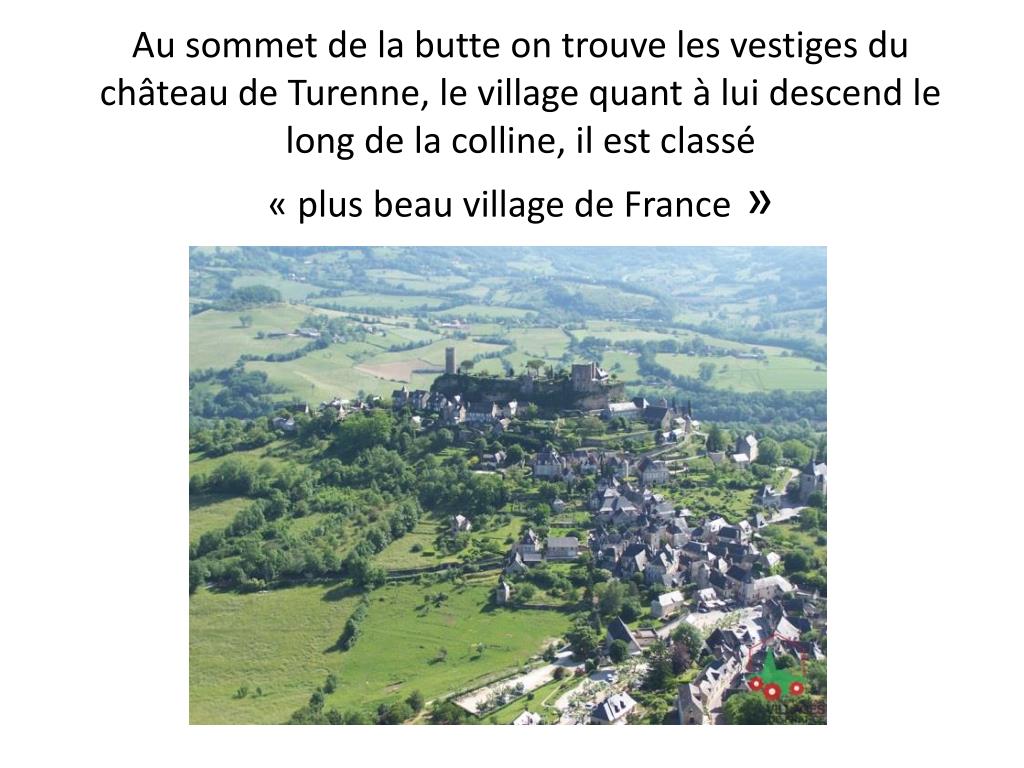 Au sommet de la butte on trouve les vestiges du château de Turenne, le village quant à lui descend le long de la colline, il est classé « plus beau village de France »