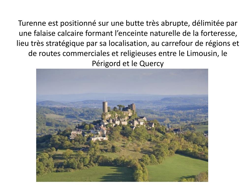 Turenne est positionné sur une butte très abrupte, délimitée par une falaise calcaire formant l’enceinte naturelle de la forteresse, lieu très stratégique par sa localisation, au carrefour de régions et de routes commerciales et religieuses entre le Limousin, le Périgord et le Quercy