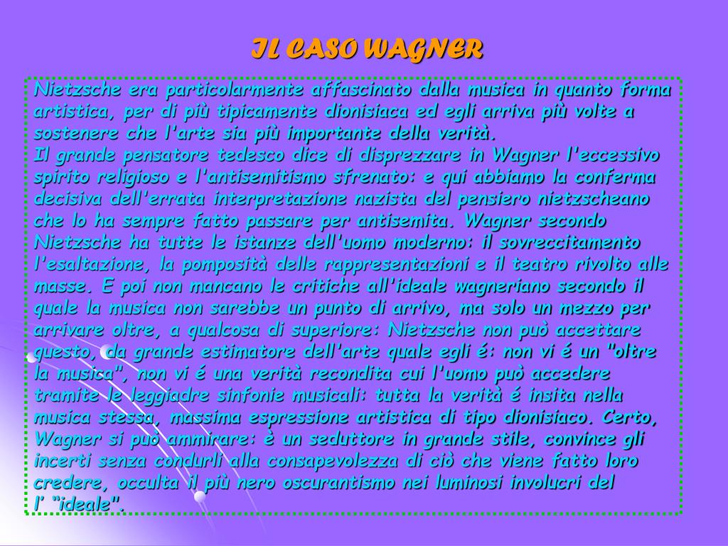 IL CASO WAGNER Nietzsche era particolarmente affascinato dalla musica in quanto forma artistica, per di più tipicamente dionisiaca ed egli arriva più volte a sostenere che l'arte sia più importante della verità. Il grande pensatore tedesco dice di disprezzare in Wagner l'eccessivo spirito religioso e l'antisemitismo sfrenato: e qui abbiamo la conferma decisiva dell'errata interpretazione nazista del pensiero nietzscheano che lo ha sempre fatto passare per antisemita. Wagner secondo Nietzsche ha tutte le istanze dell'uomo moderno: il sovreccitamento l'esaltazione, la pomposità delle rappresentazioni e il teatro rivolto alle masse. E poi non mancano le critiche all'ideale wagneriano secondo il quale la musica non sarebbe un punto di arrivo, ma solo un mezzo per arrivare oltre, a qualcosa di superiore: Nietzsche non può accettare questo, da grande estimatore dell'arte quale egli é: non vi é un "oltre la musica", non vi é una verità recondita cui l'uomo può accedere tramite le leggiadre sinfonie musicali: tutta la verità é insita nella musica stessa, massima espressione artistica di tipo dionisiaco. Certo, Wagner si può ammirare: è un seduttore in grande stile, convince gli incerti senza condurli alla consapevolezza di ciò che viene fatto loro credere, occulta il più nero oscurantismo nei luminosi involucri del l’ “ideale".