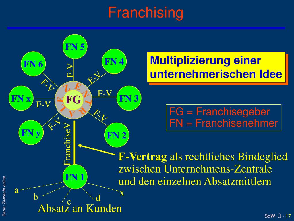 FN 5 FN 5 FN 4 FN 6 FN 4 F-V F-V F-V E Z FN x FN 3 F-V N FG FN x FN 3 E T F-V L R A F-V F-V FN y FN 2 FN y FN 2 FranchiseV FN 1 FN 1 a x b d c Franchising Multiplizierung einer unternehmerischen Idee FG = Franchisegeber FN = Franchisenehmer F-Vertrag als rechtliches Bindeglied zwischen Unternehmens-Zentrale und den einzelnen Absatzmittlern Barta: Zivilrecht online Absatz an Kunden