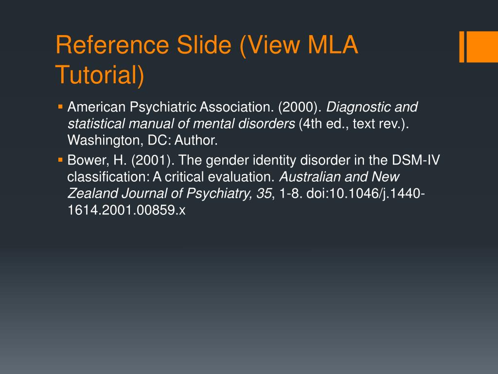 Reference Slide (View MLA Tutorial) • American Psychiatric Association. (2000). Diagnostic and statistical manual of mental disorders (4th ed., text rev.). Washington, DC: Author. • Bower, H. (2001). The gender identity disorder in the DSM-IV classification: A critical evaluation. Australian and New Zealand Journal of Psychiatry, 35, 1-8. doi:10.1046/j.1440-1614.2001.00859.x