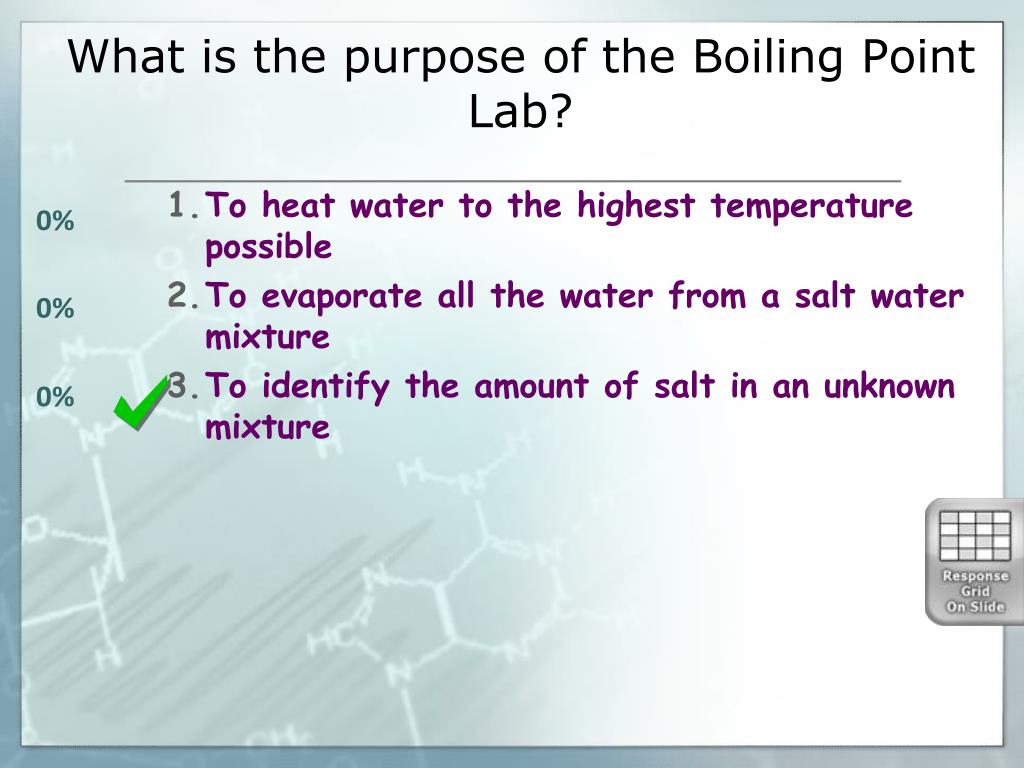 What is the purpose of the Boiling Point Lab? • To heat water to the highest temperature possible • To evaporate all the water from a salt water mixture • To identify the amount of salt in an unknown mixture