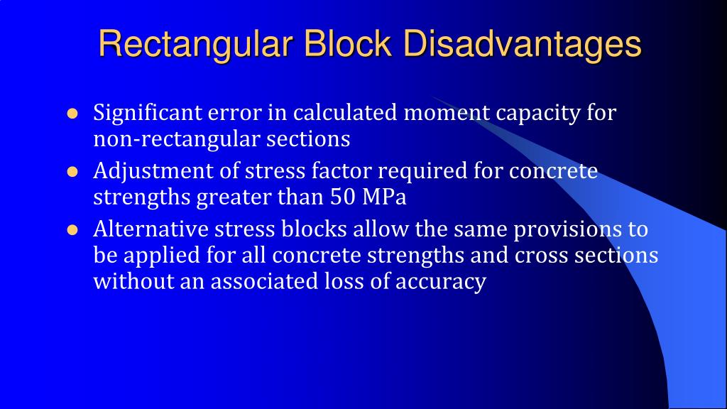 Rectangular Block Disadvantages • Significant error in calculated moment capacity for non-rectangular sections • Adjustment of stress factor required for concrete strengths greater than 50 MPa • Alternative stress blocks allow the same provisions to be applied for all concrete strengths and cross sections without an associated loss of accuracy