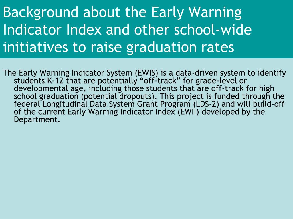Background about the Early Warning Indicator Index and other school-wide initiatives to raise graduation rates The Early Warning Indicator System (EWIS) is a data-driven system to identify students K-12 that are potentially “off-track” for grade-level or developmental age, including those students that are off-track for high school graduation (potential dropouts). This project is funded through the federal Longitudinal Data System Grant Program (LDS-2) and will build-off of the current Early Warning Indicator Index (EWII) developed by the Department.