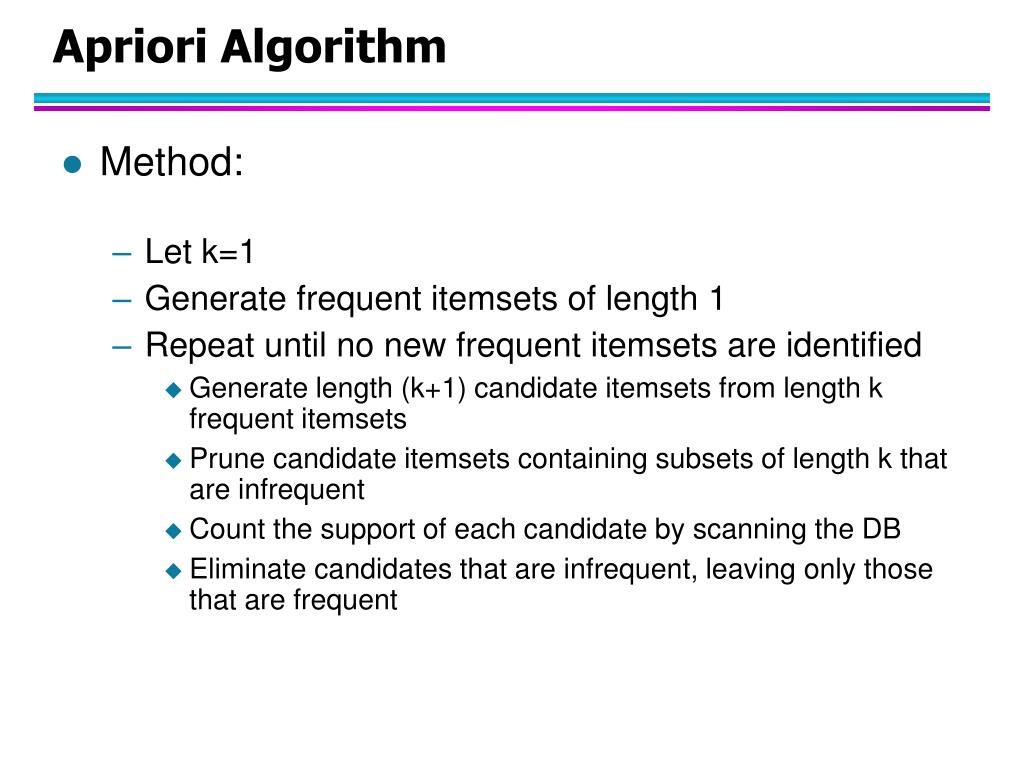 CPS 196.03: Information Management and Mining Association Rules and Frequent Itemsets. Apriori Algorithm. Method: Let k=1 Generate frequent itemsets of length 1 Repeat until no new frequent itemsets are identified Generate length (k+1) candidate itemsets from length k frequent itemsets