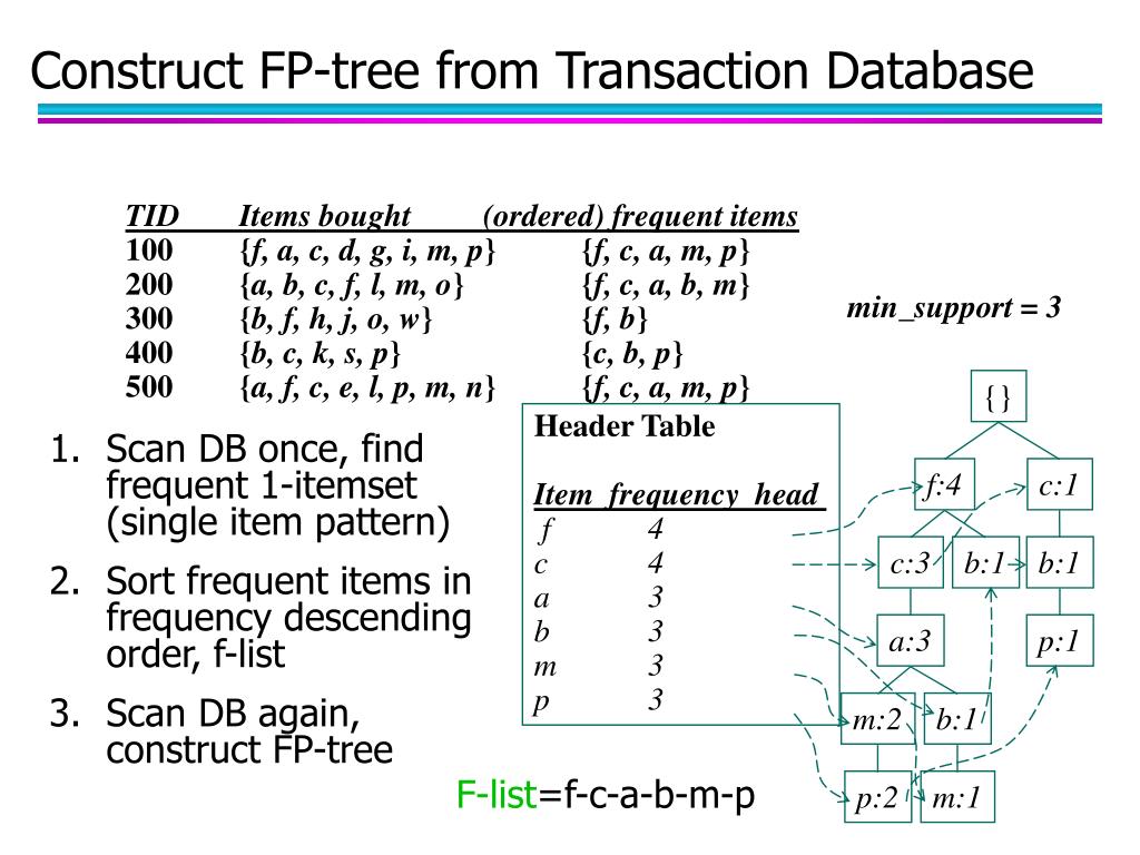 {} Header Table Item frequency head f 4 c 4 a 3 b 3 m 3 p 3 f:4 c:1 c:3 b:1 b:1 a:3 p:1 m:2 b:1 p:2 m:1 Construct FP-tree from Transaction Database TID Items bought (ordered) frequent items 100 {f, a, c, d, g, i, m, p}{f, c, a, m, p} 200 {a, b, c, f, l, m, o}{f, c, a, b, m} 300 {b, f, h, j, o, w}{f, b} 400 {b, c, k, s, p}{c, b, p} 500{a, f, c, e, l, p, m, n}{f, c, a, m, p} min_support = 3 • Scan DB once, find frequent 1-itemset (single item pattern) • Sort frequent items in frequency descending order, f-list • Scan DB again, construct FP-tree F-list=f-c-a-b-m-p