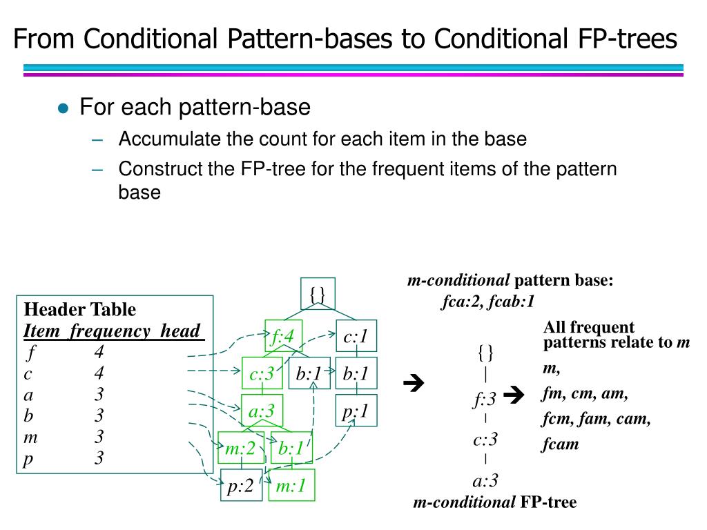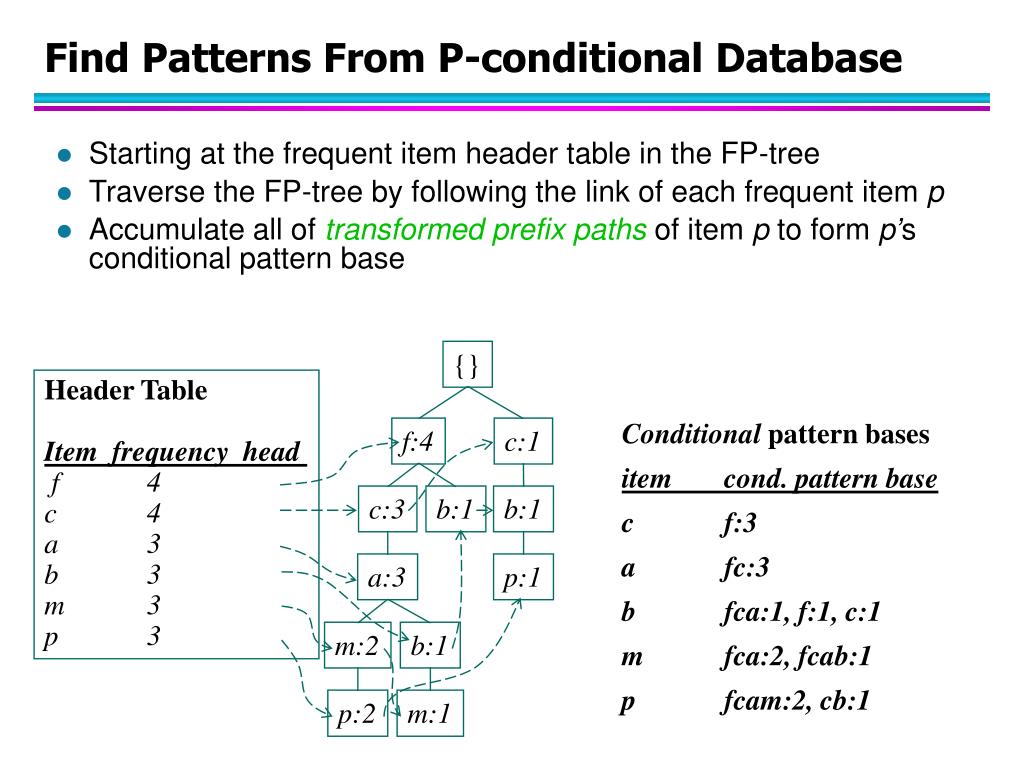 {} Header Table Item frequency head f 4 c 4 a 3 b 3 m 3 p 3 f:4 c:1 c:3 b:1 b:1 a:3 p:1 m:2 b:1 p:2 m:1 Find Patterns From P-conditional Database • Starting at the frequent item header table in the FP-tree • Traverse the FP-tree by following the link of each frequent item p • Accumulate all of transformed prefix paths of item p to form p’s conditional pattern base Conditional pattern bases item cond. pattern base c f:3 a fc:3 b fca:1, f:1, c:1 m fca:2, fcab:1 p fcam:2, cb:1