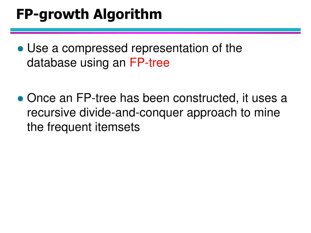 FP-growth Algorithm • Use a compressed representation of the database using an FP-tree • Once an FP-tree has been constructed, it uses a recursive divide-and-conquer approach to mine the frequent itemsets