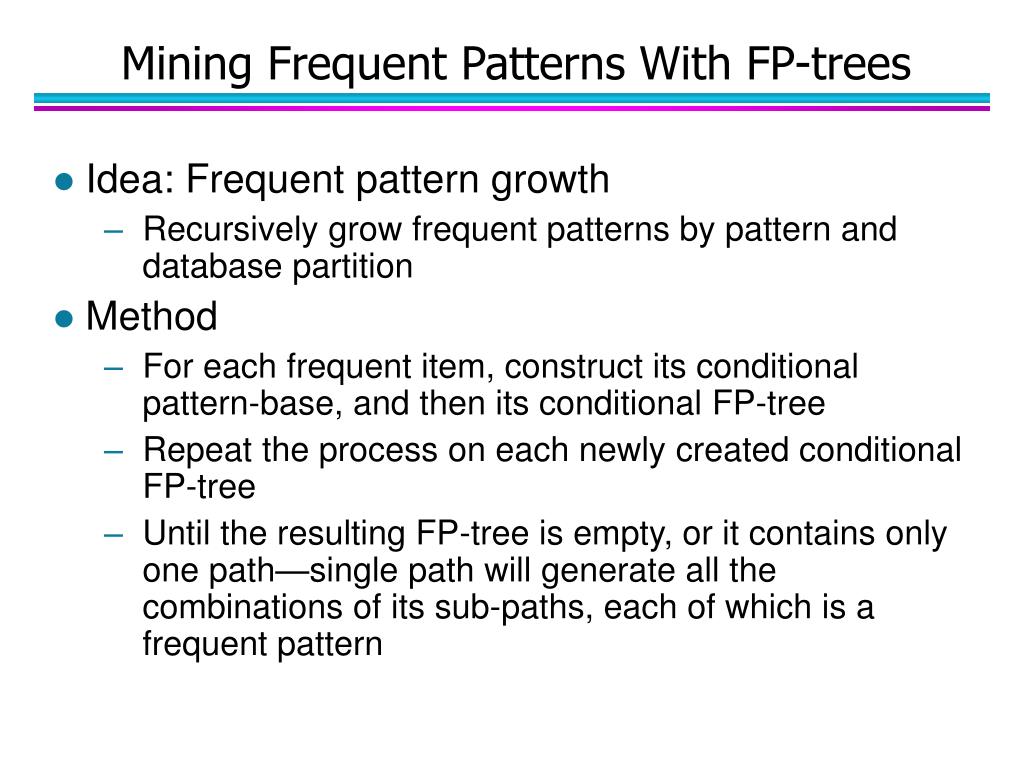 Mining Frequent Patterns With FP-trees • Idea: Frequent pattern growth • Recursively grow frequent patterns by pattern and database partition • Method • For each frequent item, construct its conditional pattern-base, and then its conditional FP-tree • Repeat the process on each newly created conditional FP-tree • Until the resulting FP-tree is empty, or it contains only one path—single path will generate all the combinations of its sub-paths, each of which is a frequent pattern