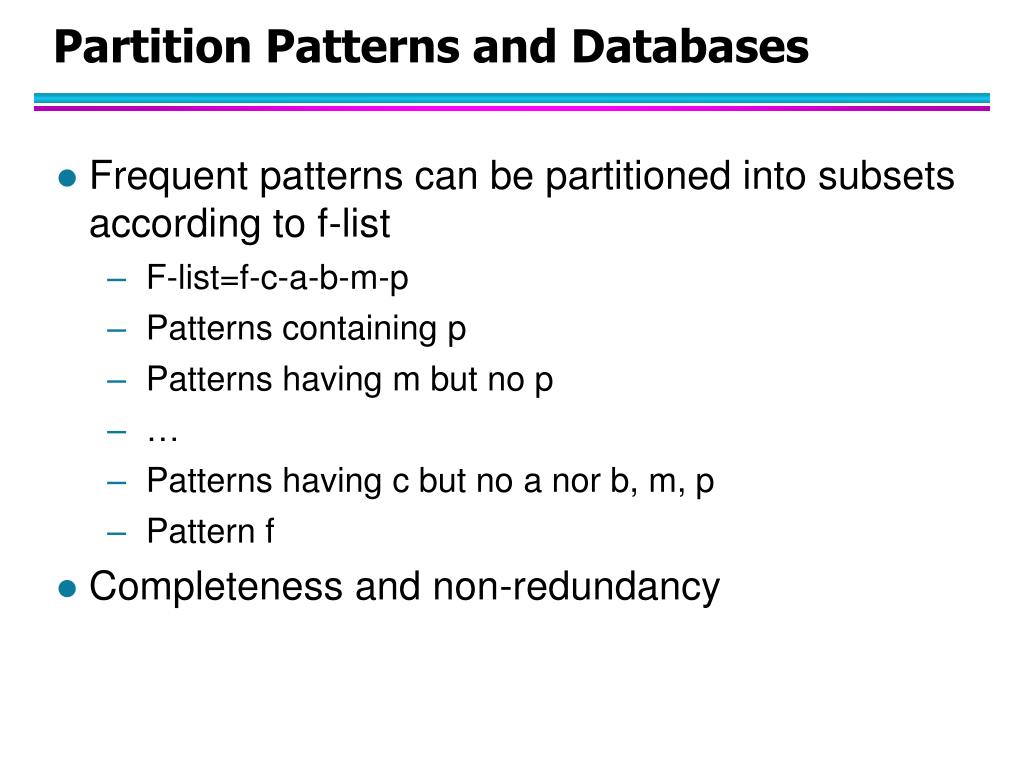 Partition Patterns and Databases • Frequent patterns can be partitioned into subsets according to f-list • F-list=f-c-a-b-m-p • Patterns containing p • Patterns having m but no p • … • Patterns having c but no a nor b, m, p • Pattern f • Completeness and non-redundancy