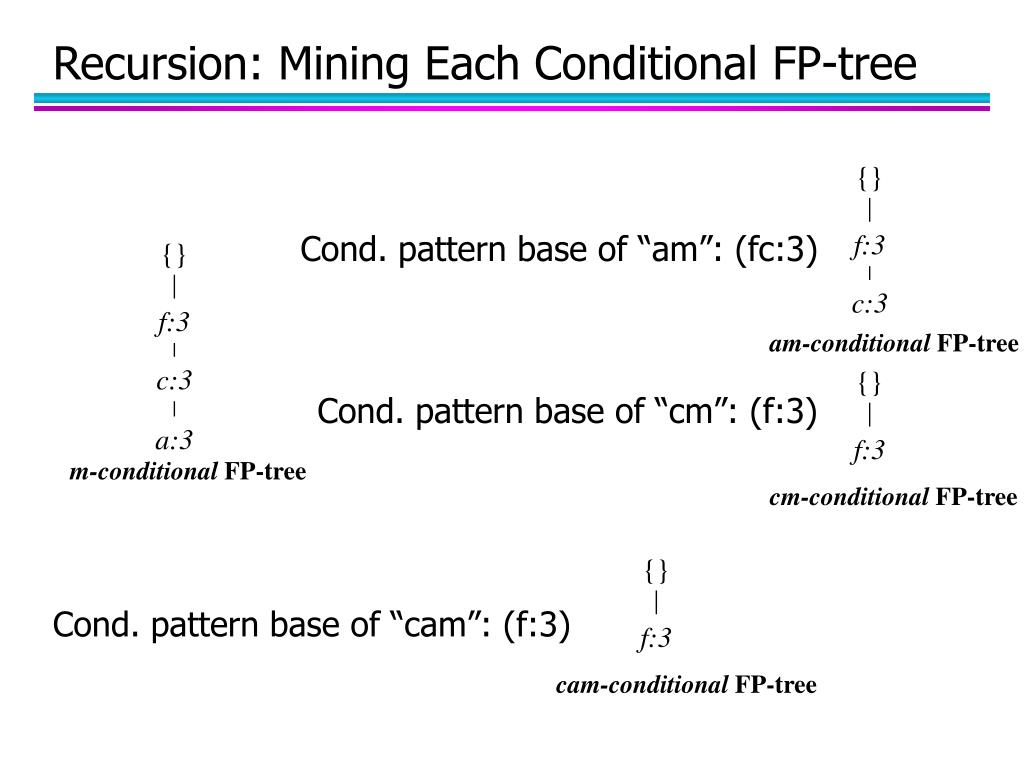 {} f:3 c:3 a:3 m-conditional FP-tree From Conditional Pattern-bases to Conditional FP-trees • For each pattern-base • Accumulate the count for each item in the base • Construct the FP-tree for the frequent items of the pattern base • m-conditional pattern base: • fca:2, fcab:1 {} Header Table Item frequency head f 4 c 4 a 3 b 3 m 3 p 3 All frequent patterns relate to m m, fm, cm, am, fcm, fam, cam, fcam f:4 c:1 c:3 b:1 b:1 a:3 p:1 m:2 b:1 p:2 m:1