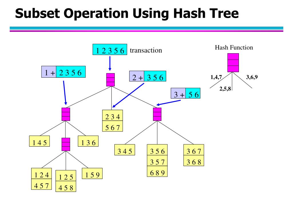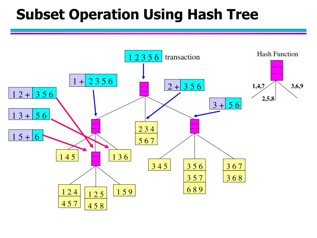Hash Function 2 + 1 + 1 5 + 3 + 1 3 + 1 2 + 6 5 6 5 6 1 2 3 5 6 3 5 6 3 5 6 2 3 5 6 1,4,7 3,6,9 2,5,8 1 4 5 4 5 8 1 2 4 2 3 4 3 6 8 3 6 7 1 2 5 3 5 6 3 5 7 6 8 9 5 6 7 4 5 7 Subset Operation Using Hash Tree transaction 1 3 6 3 4 5 1 5 9