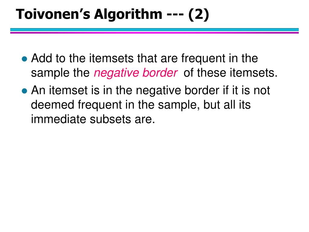 Toivonen’s Algorithm --- (2) • Add to the itemsets that are frequent in the sample the negative border of these itemsets. • An itemset is in the negative border if it is not deemed frequent in the sample, but all its immediate subsets are.