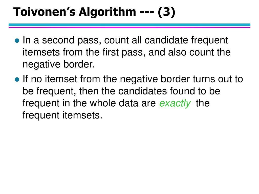 Toivonen’s Algorithm --- (3) • In a second pass, count all candidate frequent itemsets from the first pass, and also count the negative border. • If no itemset from the negative border turns out to be frequent, then the candidates found to be frequent in the whole data are exactly the frequent itemsets.