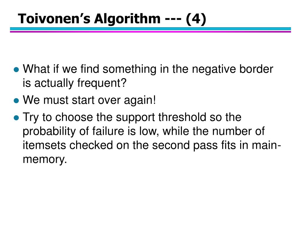 Toivonen’s Algorithm --- (4) • What if we find something in the negative border is actually frequent? • We must start over again! • Try to choose the support threshold so the probability of failure is low, while the number of itemsets checked on the second pass fits in main-memory.