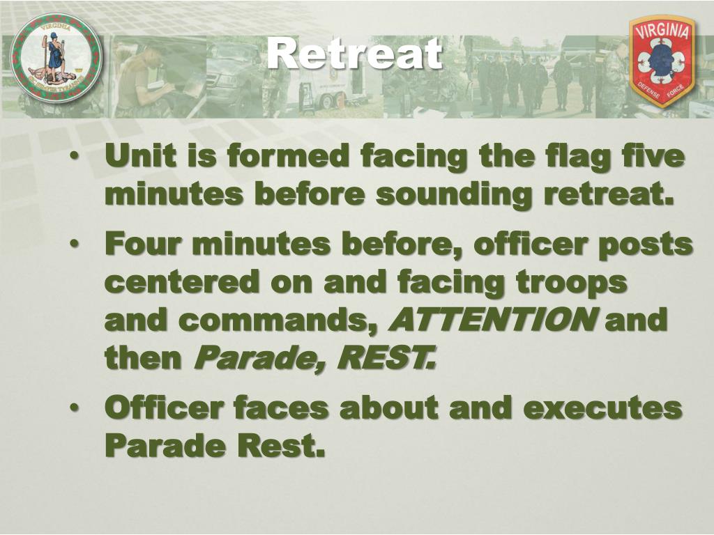 Retreat Unit is formed facing the flag five minutes before sounding retreat. Four minutes before, officer posts centered on and facing troops and commands, ATTENTION and then Parade, REST. Officer faces about and executes Parade Rest.
