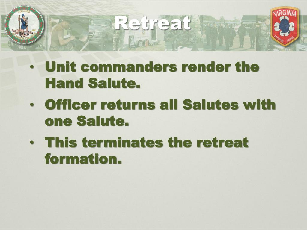 Retreat Unit commanders render the Hand Salute. Officer returns all Salutes with one Salute. This terminates the retreat formation.