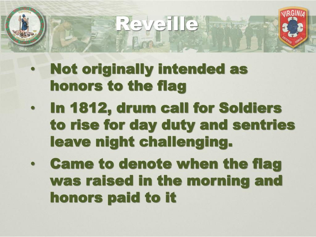 Reveille Not originally intended as honors to the flag In 1812, drum call for Soldiers to rise for day duty and sentries leave night challenging. Came to denote when the flag was raised in the morning and honors paid to it