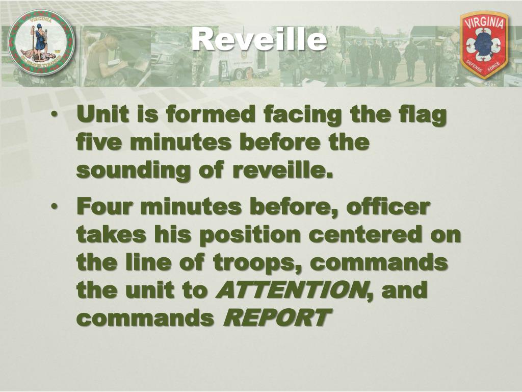 Reveille Unit is formed facing the flag five minutes before the sounding of reveille. Four minutes before, officer takes his position centered on the line of troops, commands the unit to ATTENTION, and commands REPORT