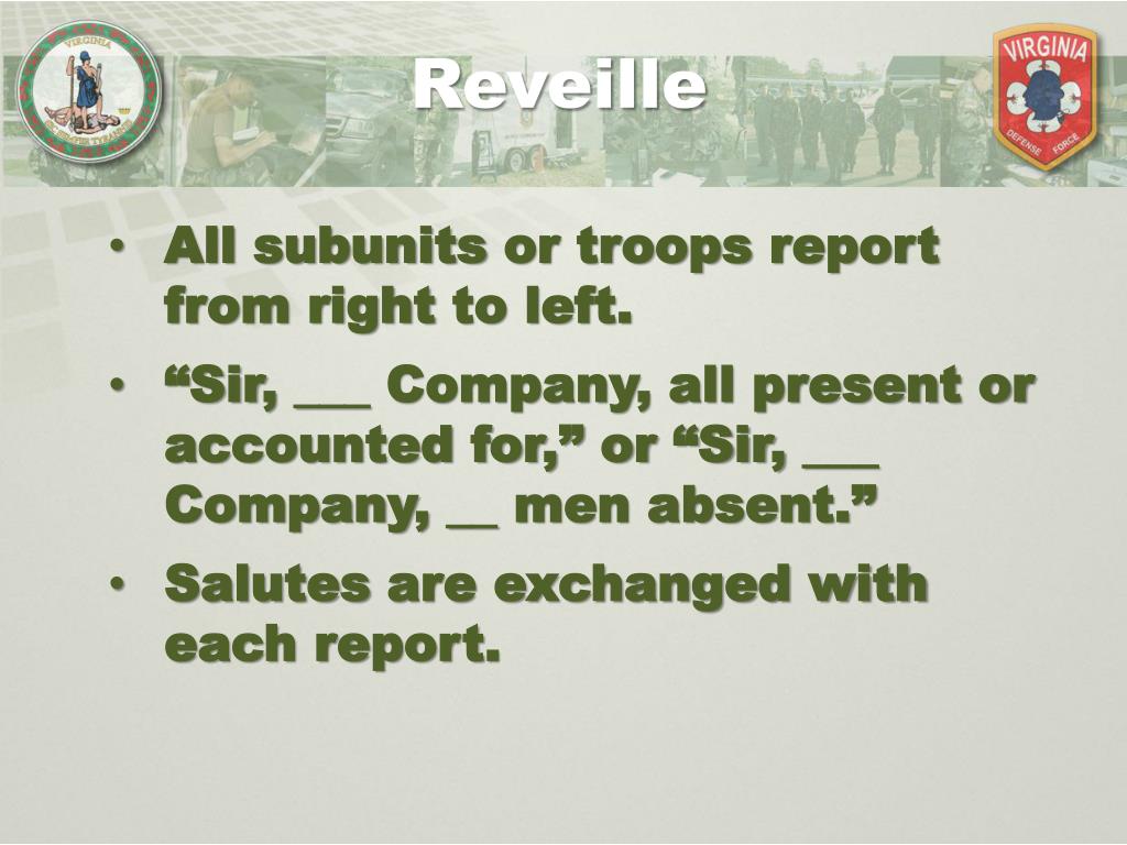 Reveille All subunits or troops report from right to left. “Sir, ___ Company, all present or accounted for,” or “Sir, ___ Company, __ men absent.” Salutes are exchanged with each report.