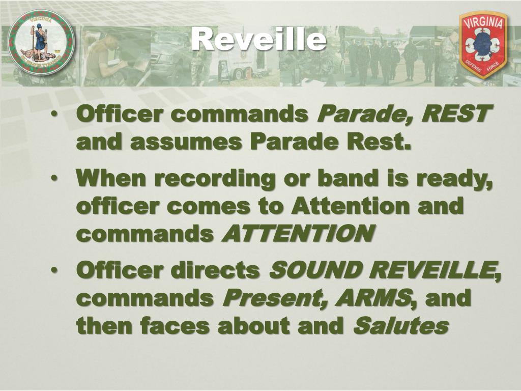 Reveille Officer commands Parade, REST and assumes Parade Rest. When recording or band is ready, officer comes to Attention and commands ATTENTION Officer directs SOUND REVEILLE, commands Present, ARMS, and then faces about and Salutes