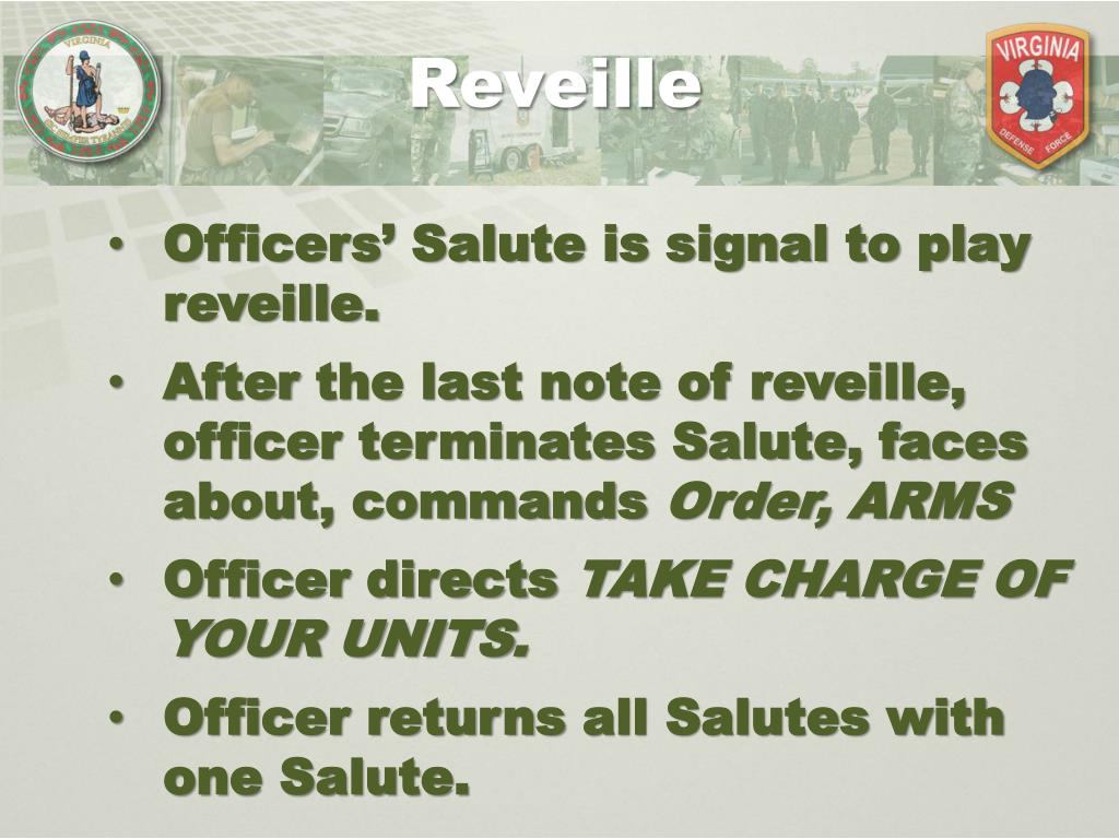 Reveille Officers’ Salute is signal to play reveille. After the last note of reveille, officer terminates Salute, faces about, commands Order, ARMS Officer directs TAKE CHARGE OF YOUR UNITS. Officer returns all Salutes with one Salute.