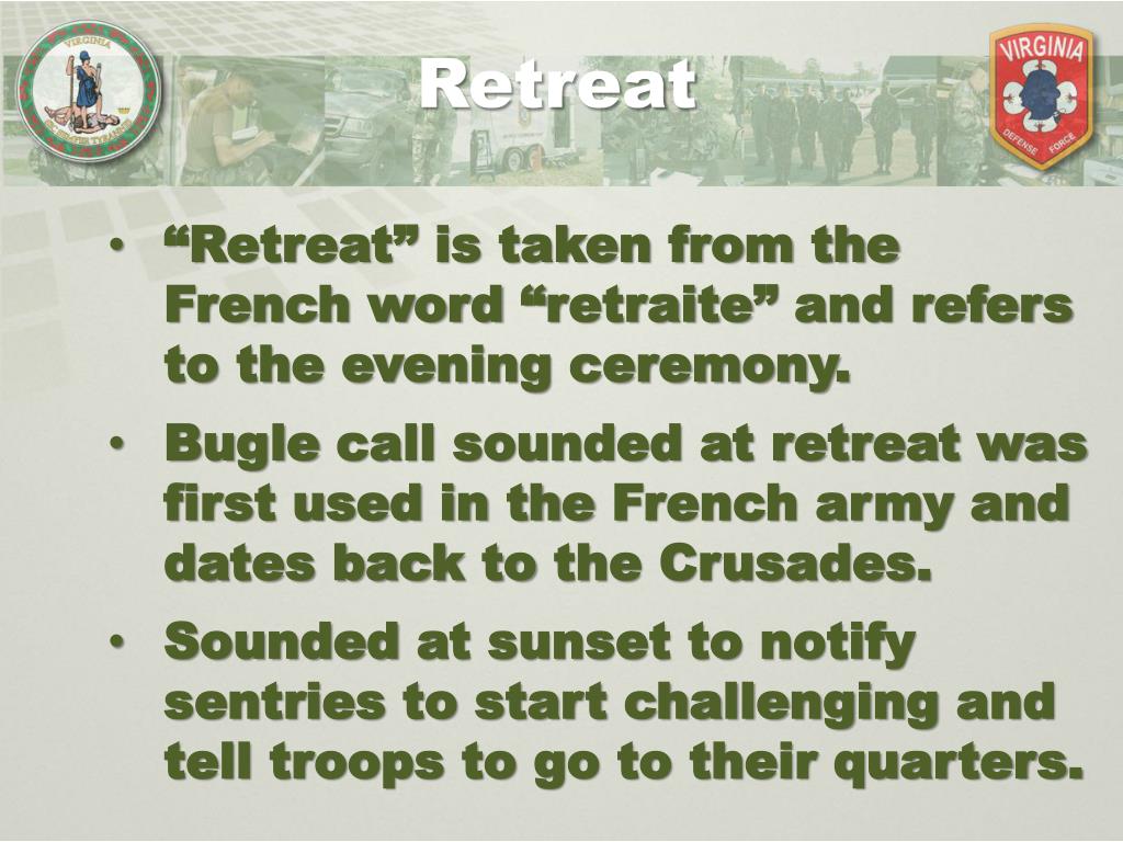 Retreat “Retreat” is taken from the French word “retraite” and refers to the evening ceremony. Bugle call sounded at retreat was first used in the French army and dates back to the Crusades. Sounded at sunset to notify sentries to start challenging and tell troops to go to their quarters.