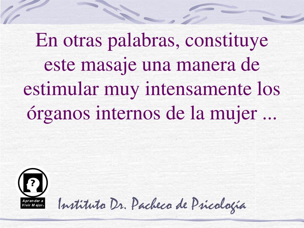 En otras palabras, constituye este masaje una manera de estimular muy intensamente los órganos internos de la mujer ... Instituto Dr. Pacheco de Psicología