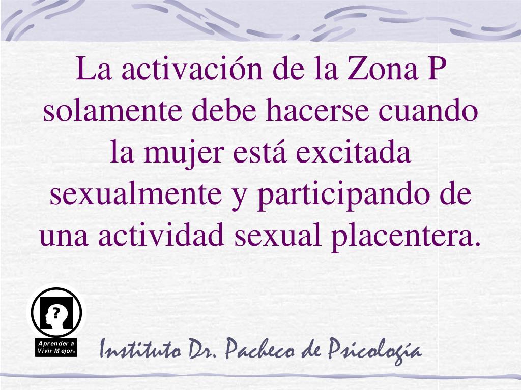 La activación de la Zona P solamente debe hacerse cuando la mujer está excitada sexualmente y participando de una actividad sexual placentera. Instituto Dr. Pacheco de Psicología