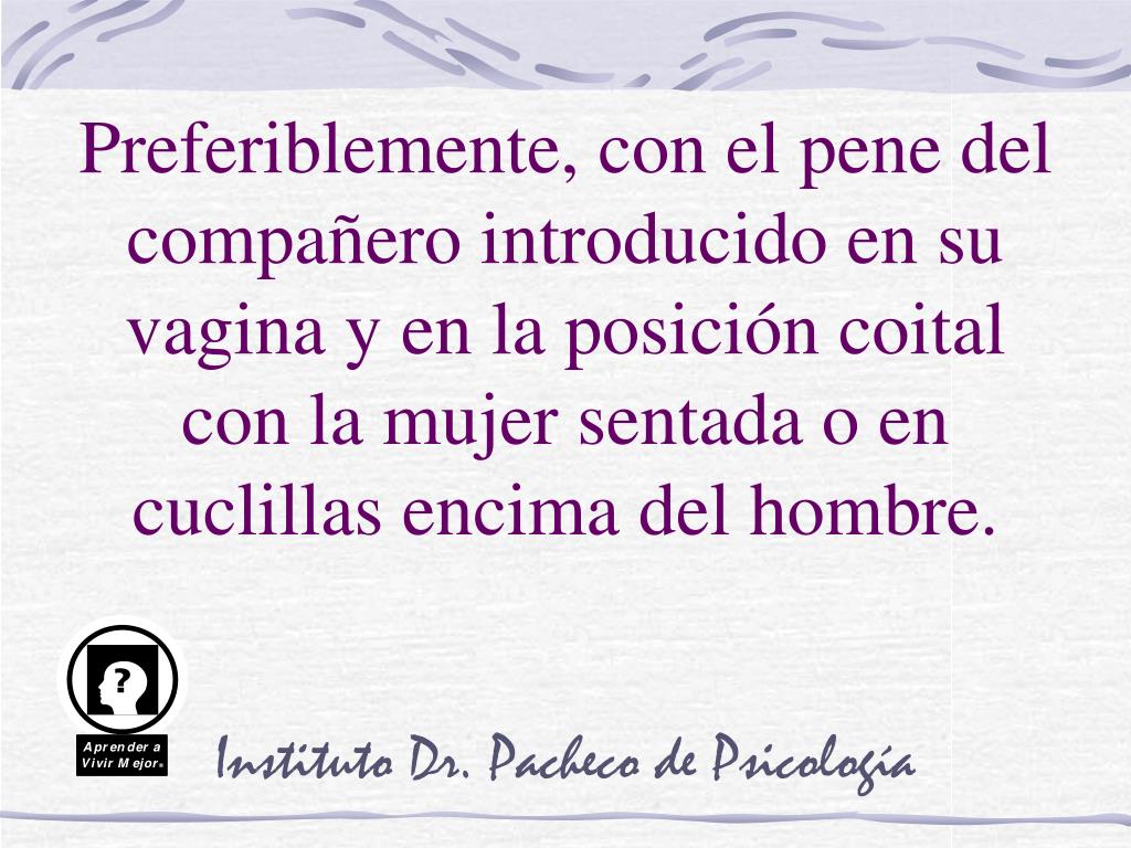 Preferiblemente, con el pene del compañero introducido en su vagina y en la posición coital con la mujer sentada o en cuclillas encima del hombre. Instituto Dr. Pacheco de Psicología