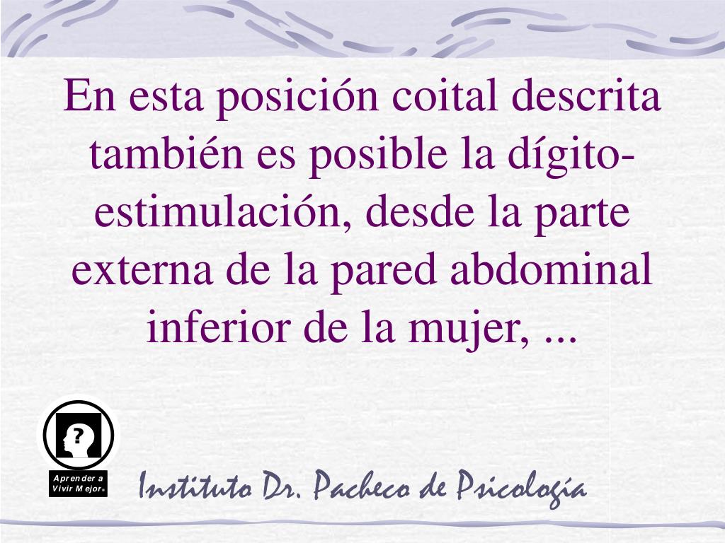 En esta posición coital descrita también es posible la dígito-estimulación, desde la parte externa de la pared abdominal inferior de la mujer, ... Instituto Dr. Pacheco de Psicología