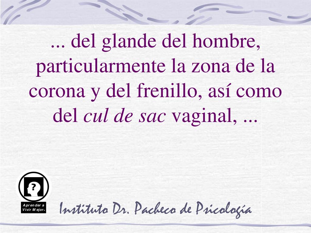 ... del glande del hombre, particularmente la zona de la corona y del frenillo, así como del cul de sac vaginal, ... Instituto Dr. Pacheco de Psicología