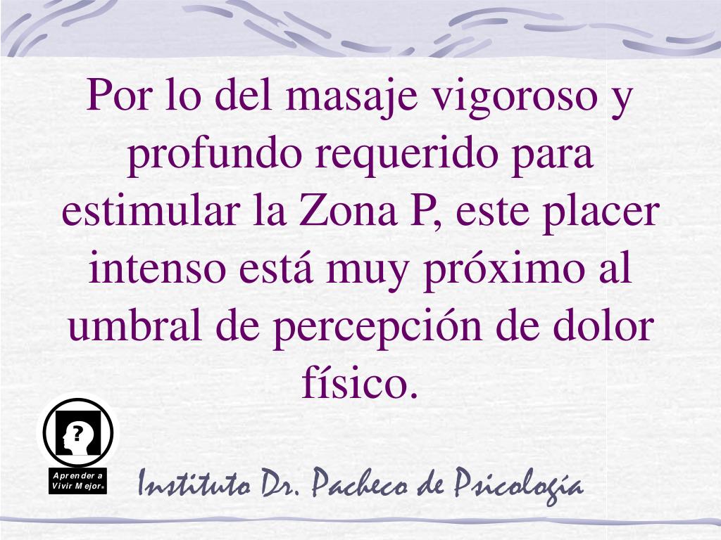 Por lo del masaje vigoroso y profundo requerido para estimular la Zona P, este placer intenso está muy próximo al umbral de percepción de dolor físico. Instituto Dr. Pacheco de Psicología