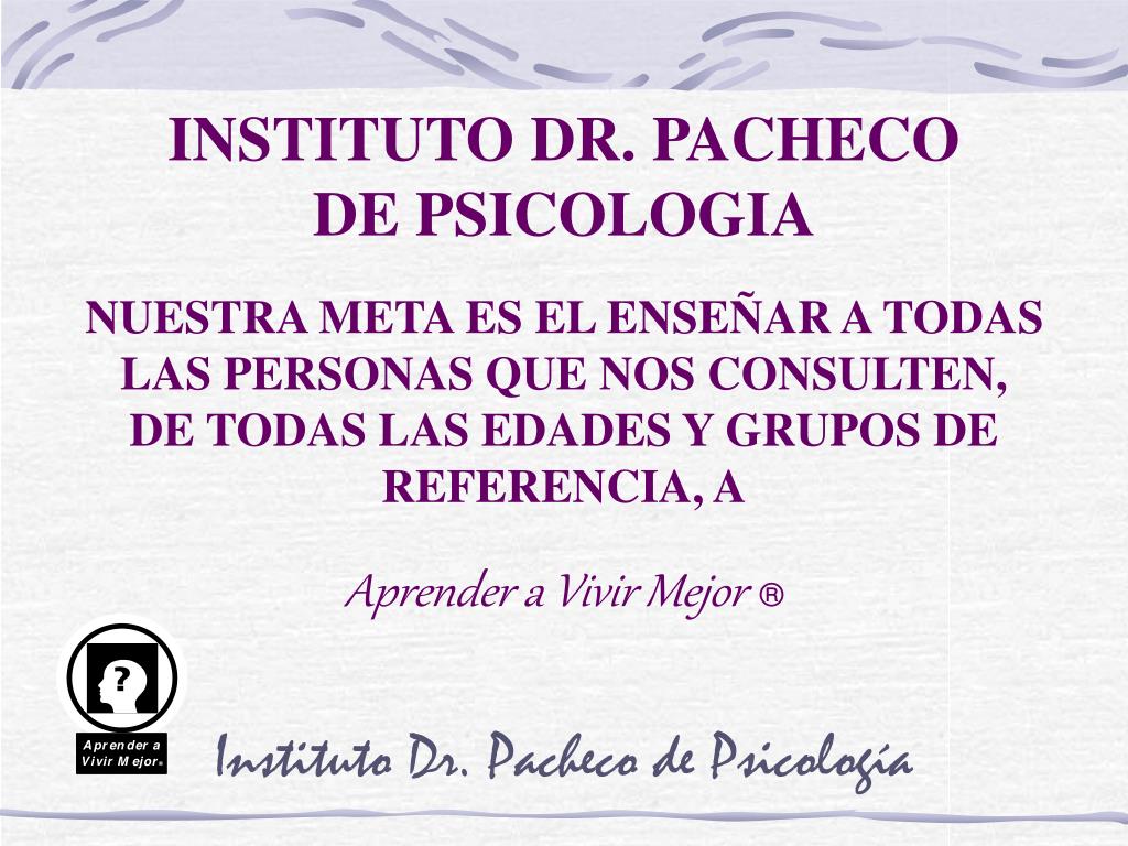 INSTITUTO DR. PACHECODE PSICOLOGIANUESTRA META ES EL ENSEÑAR A TODAS LAS PERSONAS QUE NOS CONSULTEN, DE TODAS LAS EDADES Y GRUPOS DE REFERENCIA, AAprender a Vivir Mejor® Instituto Dr. Pacheco de Psicología