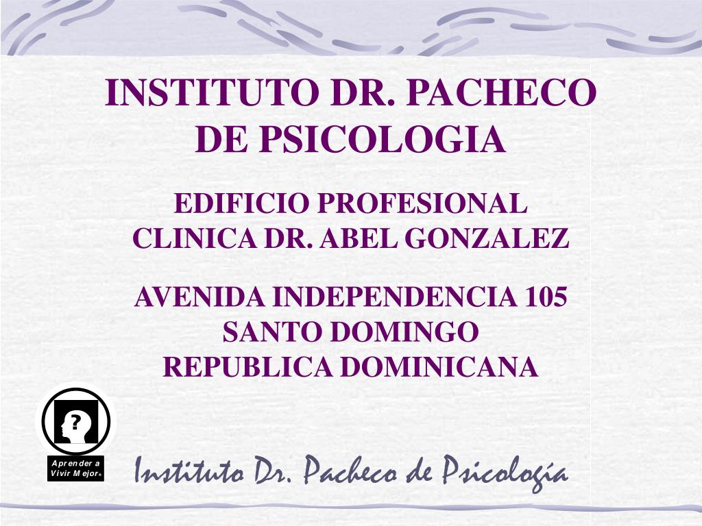 INSTITUTO DR. PACHECODE PSICOLOGIAEDIFICIO PROFESIONALCLINICA DR. ABEL GONZALEZAVENIDA INDEPENDENCIA 105SANTO DOMINGOREPUBLICA DOMINICANA Instituto Dr. Pacheco de Psicología