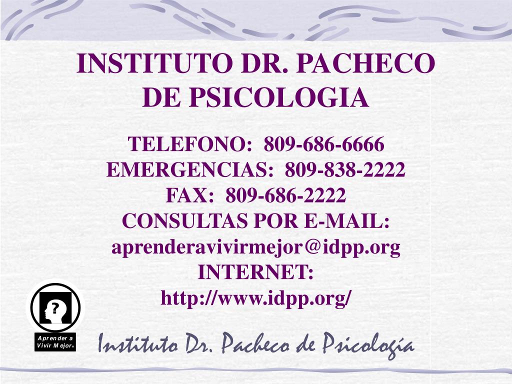 INSTITUTO DR. PACHECODE PSICOLOGIATELEFONO: 809-686-6666EMERGENCIAS: 809-838-2222FAX: 809-686-2222CONSULTAS POR E-MAIL: aprenderavivirmejor@idpp.orgINTERNET: http://www.idpp.org/ Instituto Dr. Pacheco de Psicología