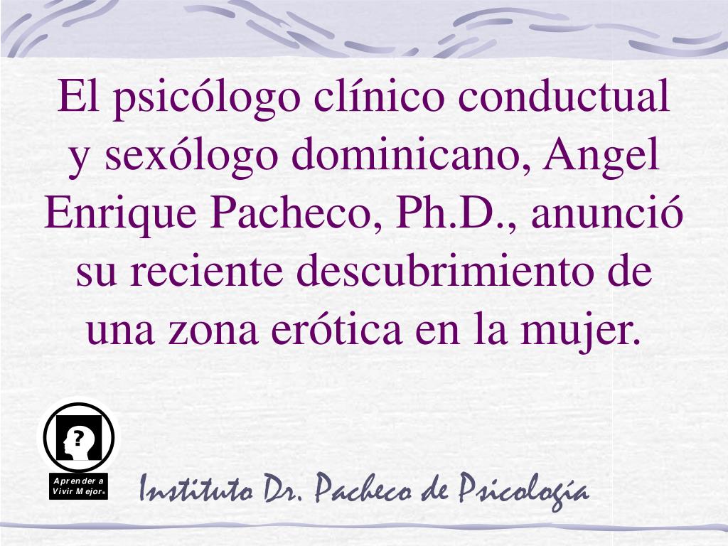 El psicólogo clínico conductual y sexólogo dominicano, Angel Enrique Pacheco, Ph.D., anunció su reciente descubrimiento de una zona erótica en la mujer. Instituto Dr. Pacheco de Psicología
