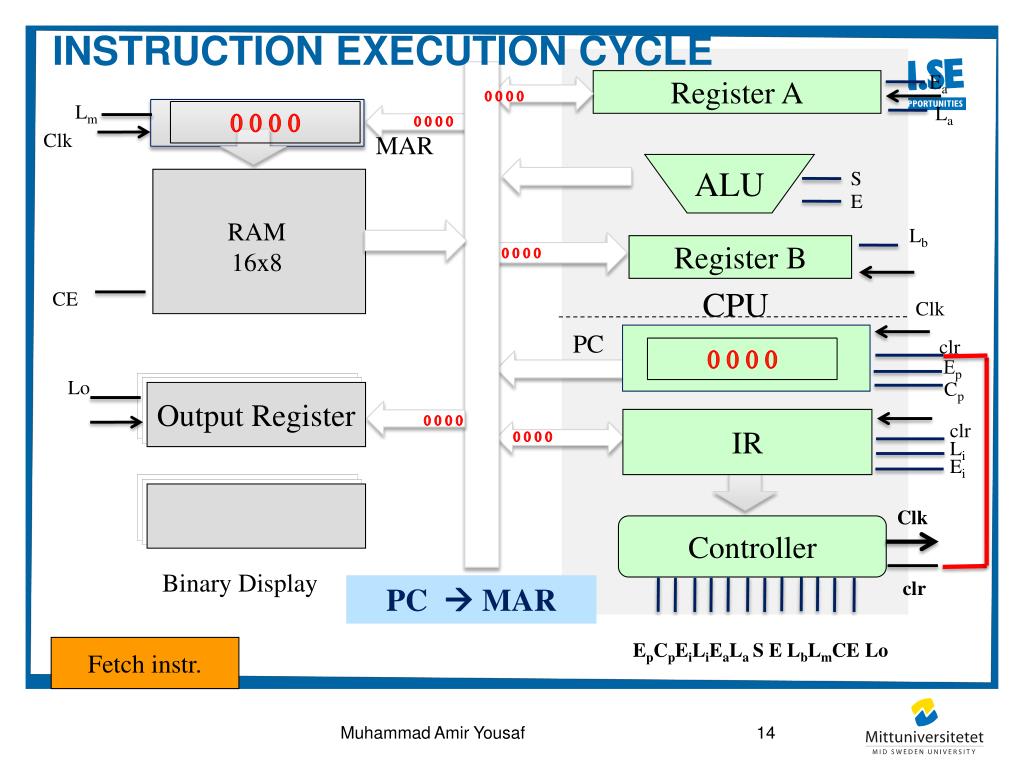 Ea Register A 0 000 Lm La 0 000 0 000 Clk MAR Instruction execution cycle ALU S E RAM 16x8 Lb Register B 0 000 CPU CE Clk PC clr 0 000 PC Ep Lo Cp Output Register 0 000 IR clr 0 000 Li Ei Clk Controller Binary Display clr PC MAR EpCpEiLiEaLaS E LbLmCE Lo Fetch instr. Muhammad Amir Yousaf