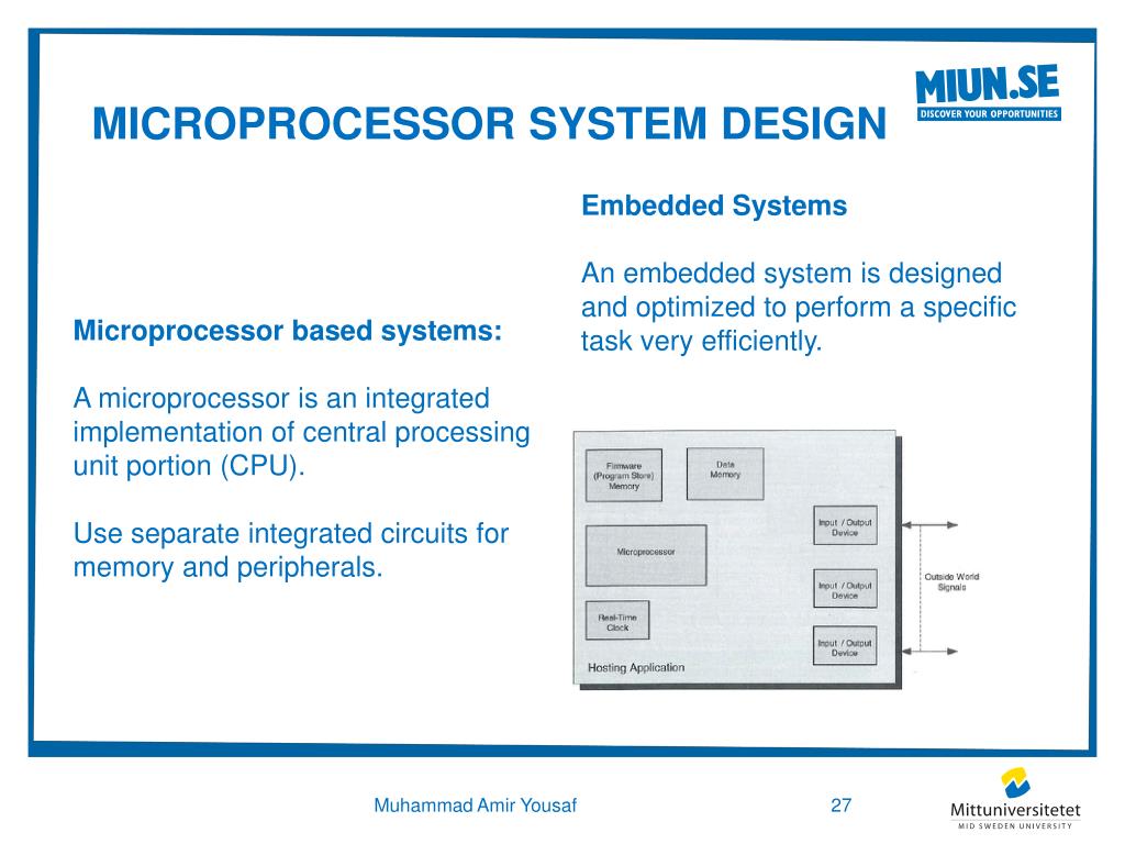 microprocessor System design Embedded Systems An embedded system is designed and optimized to perform a specific task very efficiently. Microprocessor based systems: A microprocessor is an integrated implementation of central processing unit portion (CPU). Use separate integrated circuits for memory and peripherals. Muhammad Amir Yousaf