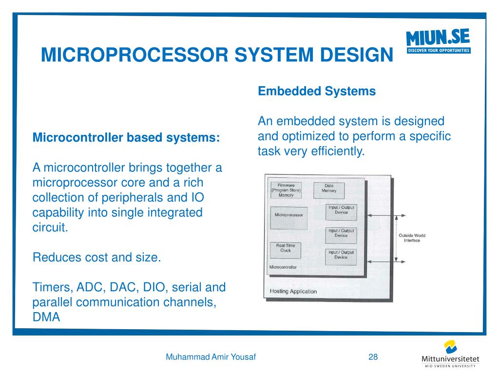 microprocessor System design Embedded Systems An embedded system is designed and optimized to perform a specific task very efficiently. Microcontroller based systems: A microcontroller brings together a microprocessor core and a rich collection of peripherals and IO capability into single integrated circuit. Reduces cost and size. Timers, ADC, DAC, DIO, serial and parallel communication channels, DMA Muhammad Amir Yousaf