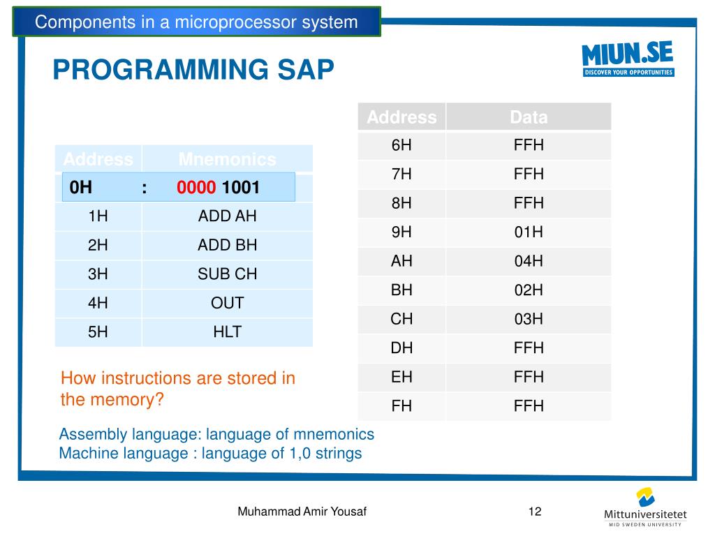 Components in a microprocessor system Programming sap 0H : 0000 1001 How instructions are stored in the memory? Assembly language: language of mnemonics Machine language : language of 1,0 strings Muhammad Amir Yousaf