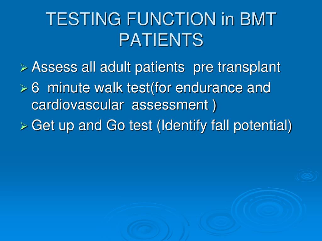 TESTING FUNCTION in BMT PATIENTS • Assess all adult patients pre transplant • 6 minute walk test(for endurance and cardiovascular assessment ) • Get up and Go test (Identify fall potential)