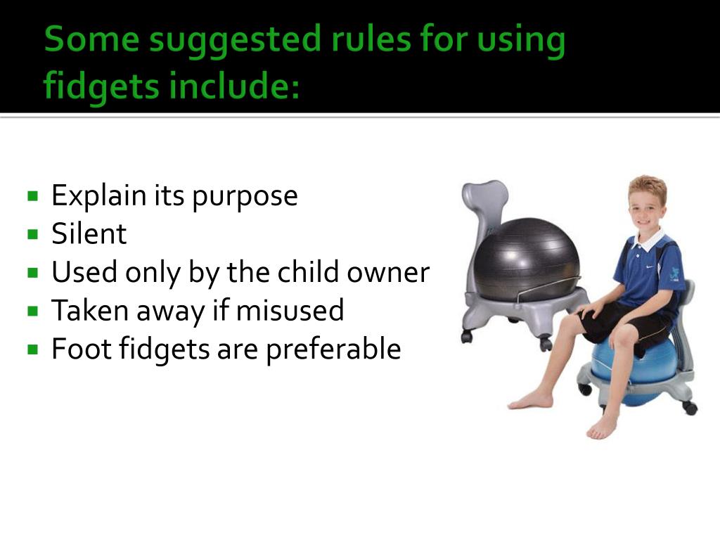 Somesuggested rules forusingfidgetsinclude: • Explain its purpose • Silent • Used only by the child owner • Taken away if misused • Foot fidgets are preferable