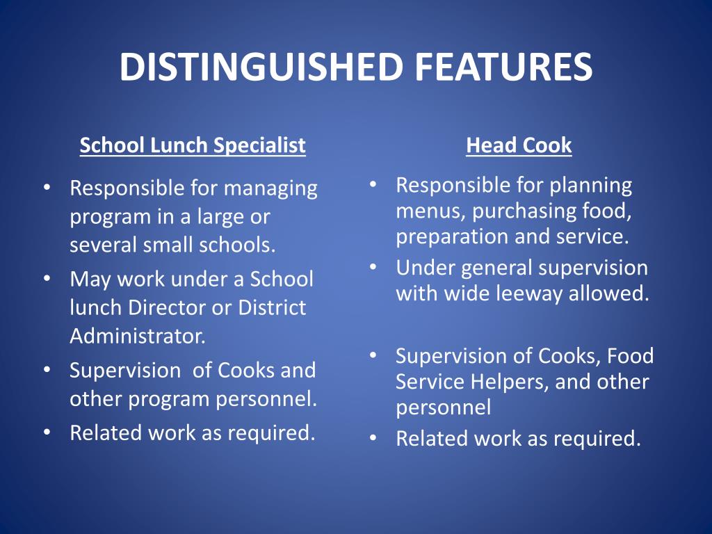 DISTINGUISHED FEATURES School Lunch Specialist Head Cook Responsible for planning menus, purchasing food, preparation and service. Under general supervision with wide leeway allowed. Supervision of Cooks, Food Service Helpers, and other personnel Related work as required. • Responsible for managing program in a large or several small schools. • May work under a School lunch Director or District Administrator. • Supervision of Cooks and other program personnel. • Related work as required.
