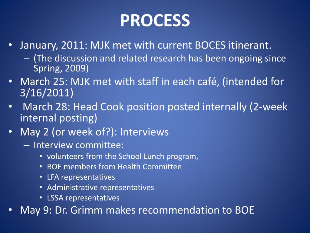 PROCESS • January, 2011: MJK met with current BOCES itinerant. • (The discussion and related research has been ongoing since Spring, 2009) • March 25: MJK met with staff in each café, (intended for 3/16/2011) • March 28: Head Cook position posted internally (2-week internal posting) • May 2 (or week of?): Interviews • Interview committee: • volunteers from the School Lunch program, • BOE members from Health Committee • LFA representatives • Administrative representatives • LSSA representatives • May 9: Dr. Grimm makes recommendation to BOE